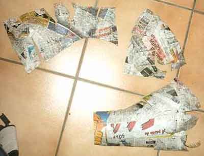 recouvrez la mousse de film alimentaire transparent. préparez un peu de colle à papier peint et des bandes de papier journal. Encollez ces bandes une à une et recouvrir la structure de mousse en lissant bien,d'une couche de papier maché.