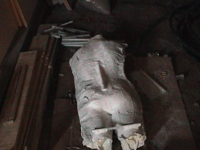 Une fois démoulé, le mannequin a exactement la forme de votre corps, mais la surface est poreuse... pour rendre la surface lisse, je met une fine couche de papier mâché : c'est très simple à faire, il s'agit juste d'entrecroiser des bandes de papier journal imbibées de colle à papier peint ; je n'en ai mis qu'une seule couche, mais vu la surface c'est quand même assez long... ça a l'avantage d'être peu cher.