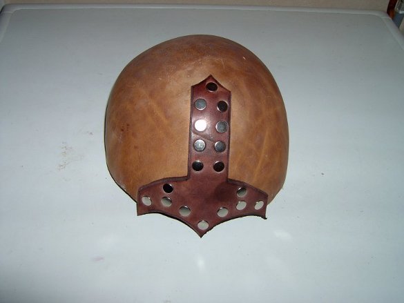 • cette forme représente une base sur laquelle peuvent se greffer différentes pièces, par exemple de la cotte de mailles, des écailles ou des lamelles couvant la nuque et les cotés de la tête, un nasal ... Beaucoup de variations sont possibles.