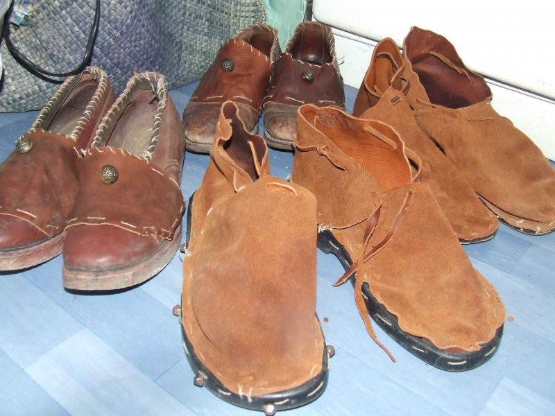 Toujours à main levée, dans mes restes de chute de cuir, j'ai fait d"autres basses chausses en mettant cette fois-ci des semelles à la place de la couture. Comme c'était vraiment des chutes de misère, elles ne sont pas toute de la même couleur. Mais après une teinture au brou de noix ou au goudron de pin il ne devrait plus y avoir de disparité de couleur...