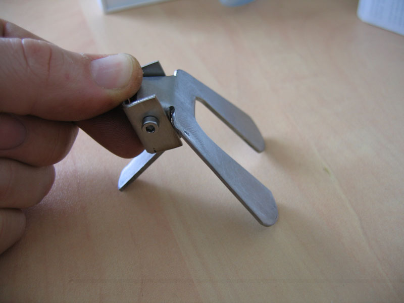 La gâchette est terminée. La patte d'appui centrale est un peu, même carrément, dégueu, je me suis loupé à 3 reprises sur le pliage, mais c'est fonctionnel. On voit le contact clippé à l'arrière de la plaque, l'axe est provisoire, je ne sais pas si je mets un axe riveté ou une vis (un peu plus de jeu).