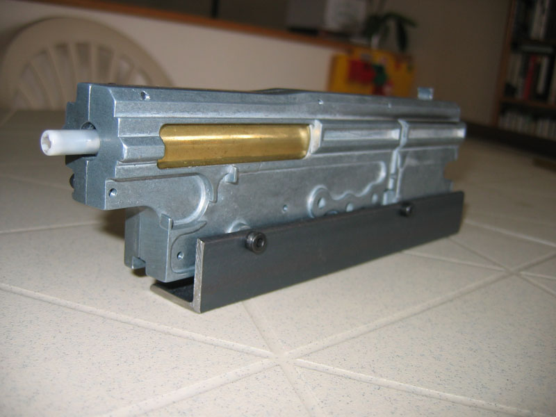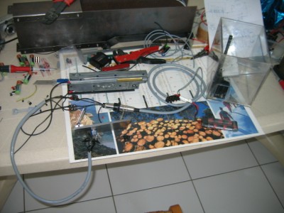 Voilà la partie la plus difficile terminée (enfin presque): la mise en place et l'alignement des éléments de tir (canons, bloc hopup, tunnel d'alim, gearbox). J'en ai sué pour ajuster tout ça, il m'aura fallu deux jours pour plier correctement le support du puits d'alim.