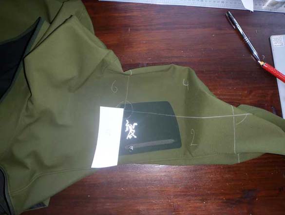 Le tissu est de type ripstop (on voit bien un quadrillage dessus), j'en profite pour tirer des lignes droites sur le tissu et positionner la feuille dessus en suivant le quadrillage originel du tissu.