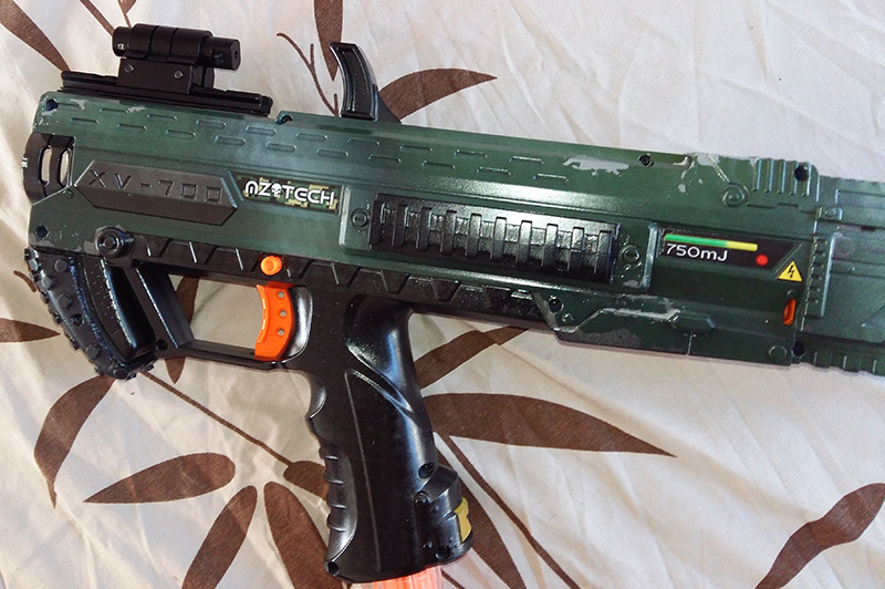 Nerf vortex praxis, très pratique pour les intérieur, les disk sont plus durable mais se perdent plus facilement (surtout les vert) j'ai moddé le ressort.