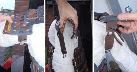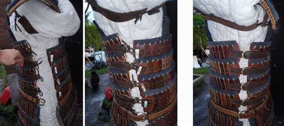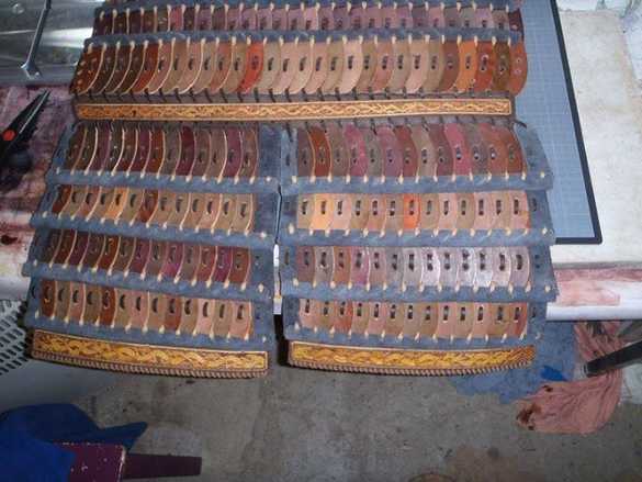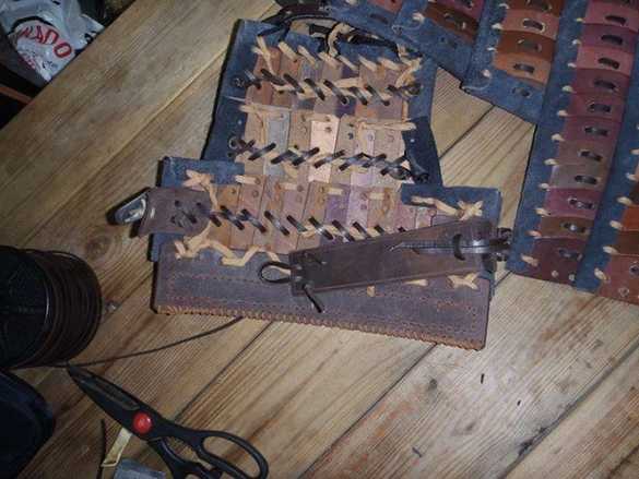 Des tas de bandes de cuir de canapé teint en noir et troué à intervalle régulier, ça ne sert qu'à faire joli sur l'armure mais c'est un gros taf au final et ça alourdit encore d'1kg l'armure.